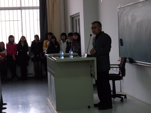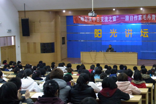 毛丹青在黑龙江大学“哈尔滨中日交流之窗”阳光讲坛演讲。(日本新华侨报网图片)