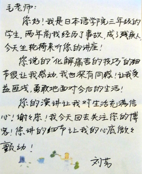 毛丹青在讲演中从细微的生活入手,比较中日两国文化的不同。在每个讲演之地,他都会介绍一名日本大学生尽管下身瘫痪,但每次都是坐在妈妈推着的轮椅上到课堂来听课的情景。当他讲到这名勤奋的学生最后还是没有战胜病魔去世后,其母亲推着空荡荡的轮椅最后一次从校园里走过的时候,台下所有的听众都为之动容。一位名叫刘芳的中国大学生在听了讲演后给毛丹青写信说:“毛老师,……两年前我经历了事故,成了残疾人,今天坐轮椅来听你的讲座!您说的‘化解痛苦的技巧’的细节很让我感动,我也深有同感。让我受益匪浅,勇敢地面对今后的生活!您的演讲让我对今后的生活充满信心!谢谢您!……您讲的细节让我的心底微微颤动!”