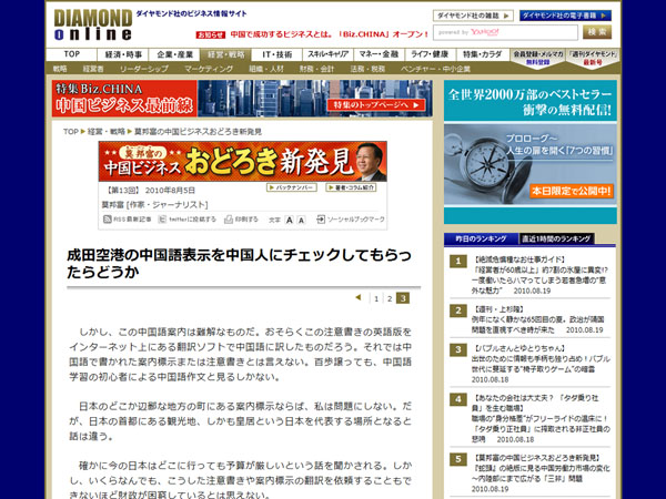 但是,要迎接大量中国游客的到来,日本真的准备好了吗?近日,著名旅日华人作家莫邦富在日本主要经济周刊《钻石》网站上连续撰文,指出日本的“国门”成田机场里,面向中国游客的一些中文标识的翻译十分粗糙,有些服务细节不如中国,工作人员在意识上还没有完全做好接待中国游客的准备。