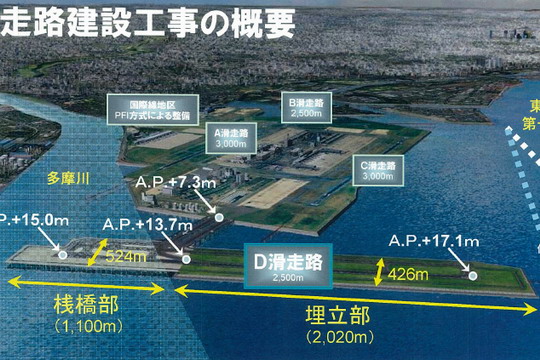 第4跑道全长2500米,地基部分全长3120米,总面积约150万平方米。值得一提的是,第4条跑道建造在海面上,有三分之二地基是填海造地,而为了不阻隔多摩川河口,跑道西南侧的三分之一采用了高架栈桥结构,类似于码头结构。填海部分和栈桥结构部分的连接点采用了伸缩装置,即便发生地震其表面的跑道也不会开裂。整个跑道通过一条620米长的桥与现有3条跑道所在的机场岛对接。