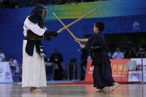9月4日,首届世界武搏会进入最后一天的较量,在中国北京科技大学体育馆进行的剑道比赛中,一对年龄与身高相差悬殊的对手之间的过招练习,赢得全场掌声,也感动了全场观众。