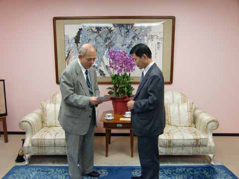 王国雄会长将长崎华侨为祖国甘肃省舟曲灾区的捐款交到李文亮总领事手中。(日本新华侨报网图片)