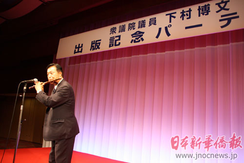 下村博文议员还邀请张永祥会长登台表演了笛子、口技文艺节目,赢得了全场一片掌声。