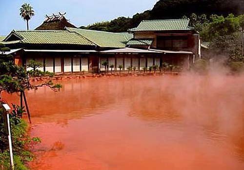 由于含有的矿物质不同,别府的温泉水常常呈现不同的颜色。海地狱就是富含镭硝酸铁,在阳光折射下,闪耀着琉璃般的湛蓝;而血池地狱早在8世纪就以“赤汤泉”闻名。它富含酸化铁,好似一池翻滚的血浆,夹杂着巨大的轰鸣声,被日本佛教徒认为是来自幽冥地狱中的激流。利用血池地狱的温泉制成的血池软膏可以治疗脚气,在日本很受欢迎。
