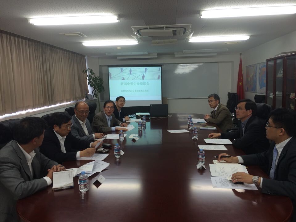 4月27日,新潟中资企业座谈会于新潟总领馆召开。中国驻日本大使馆经商处刘亚军公使、中国驻新潟总领馆何平总领事、在日中资企业协会赵方林会长、副会长彭卜钢、颜国东、新潟山形福岛宫城四县中国企业协会张成儒会长、新潟总领馆经商室有关人员等参加了会议。