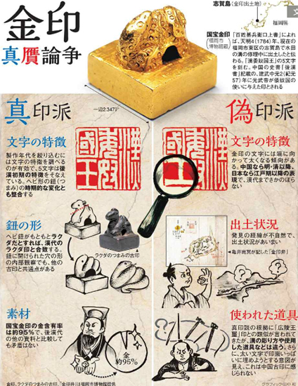 进入2018年以后,一直都将“汉倭奴国王金印”视为镇馆之宝的福冈市博物馆举办了一场有关金印真伪的公开性学术论坛。为坚持金印是真品和坚持金印是伪造的双方学者提供了一场面对面打擂台的机会。日本NPO工艺文化研究所理事长铃木勉认为,金印上文字的雕刻手法跟中国古代的雕刻手法有很大区别,绝对是后世伪造的。日本明治大学文学部教授石川日出志则表示,金印上的汉字具有中国后汉(东汉)初期的文字特征,另外金印的含金量在95%以上,这一点也和中国历史同期制造的金印一致。“江户时代的人不可能知道中国后汉时的金印的含金度,所以靠伪造是伪造不出这种纯度的。”福冈市埋藏文化财课的大塚纪宜的主张更显新奇,他认为金印上的蛇钮,其实原本是骆驼钮,当时蛇代表着南方,而骆驼代表着北方。汉朝误以为倭奴国在北方,在金印制造过程中发现搞错了,便将骆驼钮“强行”改制成蛇钮。