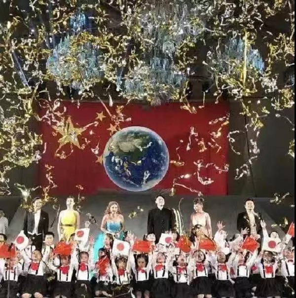 新华侨花艺空间设计师、日本华侨华人创美协会会长王玉芒带来了她的最新作品——国庆主题花艺设计,由700朵鲜花组成的大型花坛——五星红旗,艳美夺目,旁边的纪念徽标映衬主题。中国京剧舞美大师李文培带领着一批脸上绘着京剧脸谱的年轻人巡走现场,演绎着中国传统文化。金幸健一的美妆团队把刚刚从北京带回来的1000面国旗分发给与会者,让欢庆的气氛更加浓厚。日本中国旗袍总会的姐妹们穿梭翩跹秀旗袍,传递着柔美的中华情。《中文导报》社长兼总编辑杨文凯带着妻子和正在上小学六年级的儿子参加庆典晚会,他希望让儿子从小留下这种“感受”。