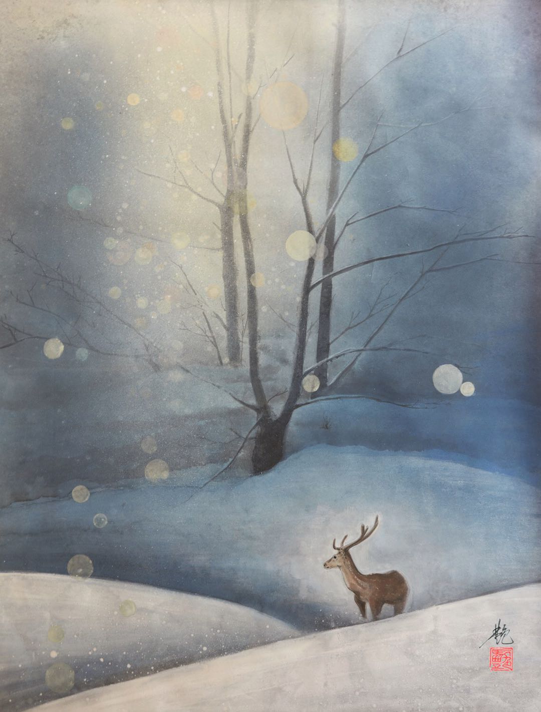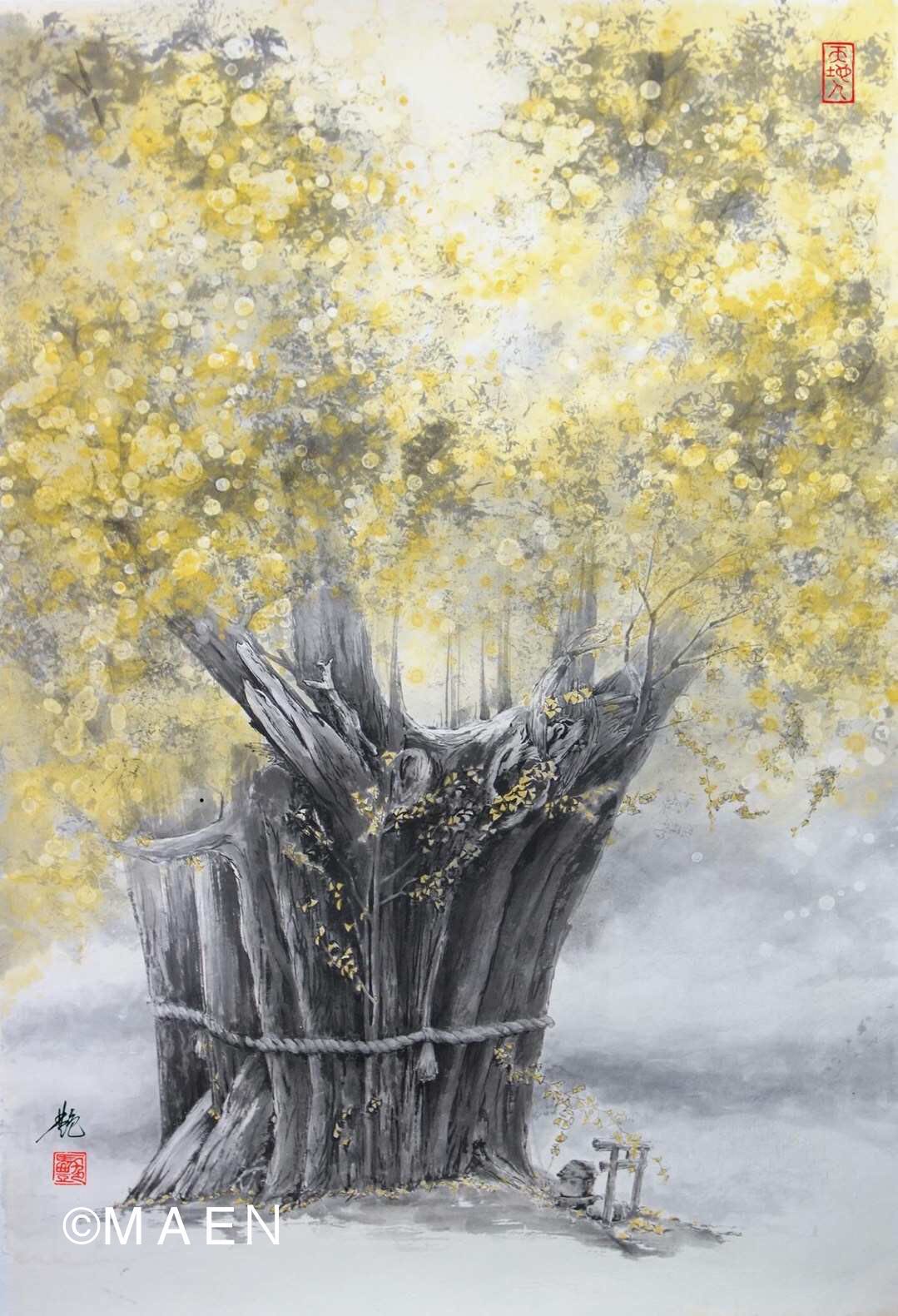 曾经在日本银座鸠居堂展览过的作品《天地人》,是一件震慑襟怀、直指人心的作品。马艳将画面定格在一个静态的瞬间,以神社、鸟居、神树和注连绳为表现对象。“人”这一物象并没有入境,却通过虚实相协的画面处理,以及浓淡得宜的色彩调和,将渺渺天地之广阔,悠悠时光之深远,人与自然之互依互存表现的深沉隽永、入骨三分。