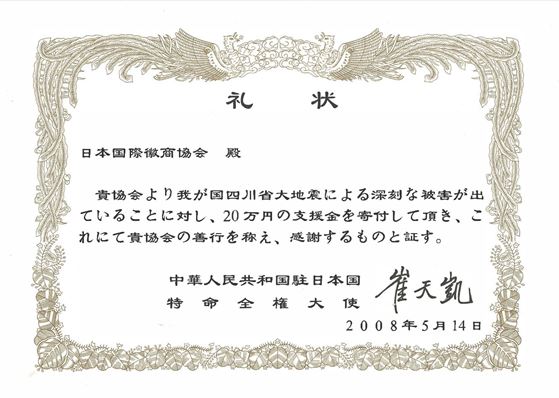 2008年5月12日,中国四川汶川发生强烈地震,当地受到重大生命与财产损失。得知此信后,日本徽商协会心急如焚,当天就一方面不断了解情况,向会员们传递灾区的讯息,另一方面立即发起募捐活动。第二天,也就是5月13日,日本徽商协会通过中国驻日本大使馆向灾区发出了一封旅日安徽籍侨胞牵挂并且激励灾民的慰问信,与此同时,提供了第一轮充满着温度的捐款。