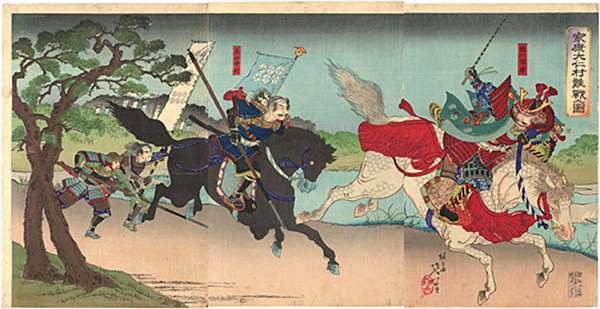 《家康大仁村难战之图》,是明治时代浮世绘画师杨斋延一的作品。装饰着六文钱家纹的军旗飒飒生风,真田幸村从左侧突进,如同一支利箭,以压倒性的气势为画面带来了力量感和紧迫感。画面的有半部分,一身红色铠甲的德川家康边战边逃,不胜狼狈。