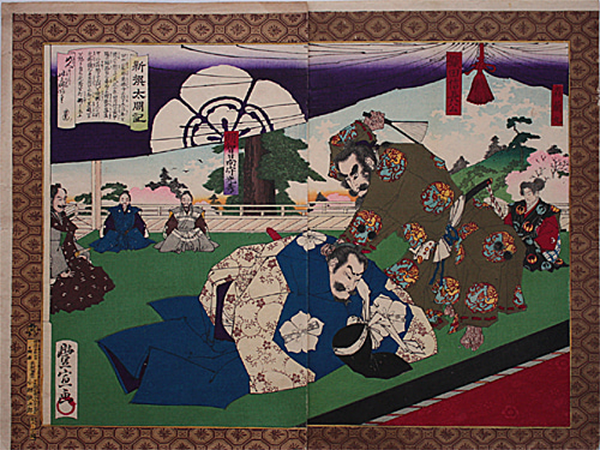 在歌川丰宣笔下的《新选太阁记》中,织田信长当众怒打为其出生入死打天下的明智光秀,众部将不敢作声,而森兰丸(织田信长偏宠的“小姓”)则在画面深处,不动声色的看戏。