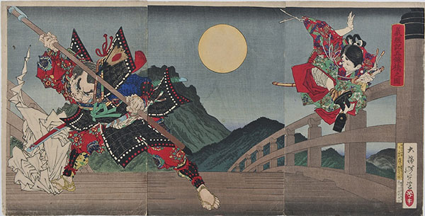 月冈芳年所绘《义经记五条桥之图》,则讲述少年时代的源义经,在鞍马寺跟大天狗学成一身本领,下山遇到神僧弁庆,将其收服的故事。