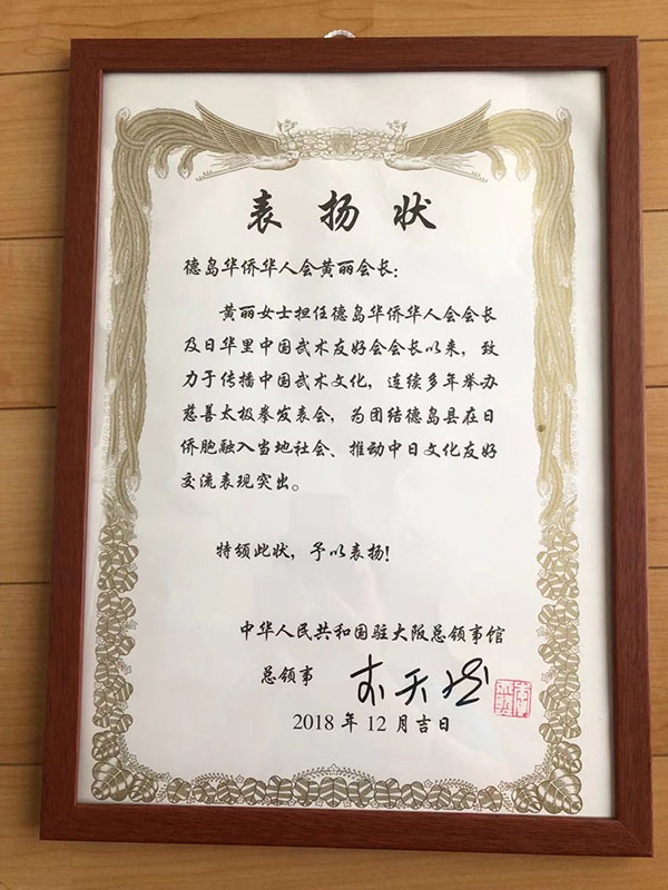 “我自己取得的一点成绩,离不开国家推广文化交流政策的扶植,离不开大阪总领馆的帮助,离不开同胞的支持。在德岛生活的时间长了,我总感觉这里的同胞们还还少了一个‘家’,我应该做点什么。”2009年,黄丽牵头成立了德岛华侨华人会。