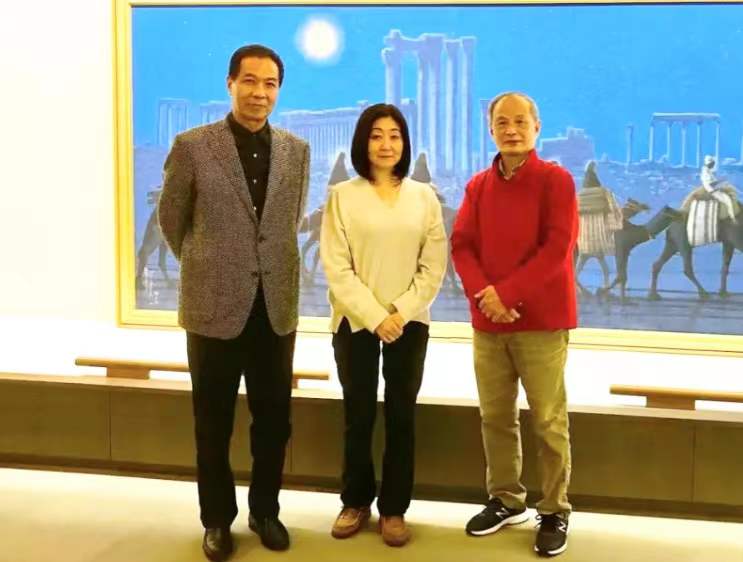 图片说明:黄山美术社社长陈建中(左一),平山郁夫丝绸之路美术馆馆长平山东子(中),作者冯学敏(右一)。