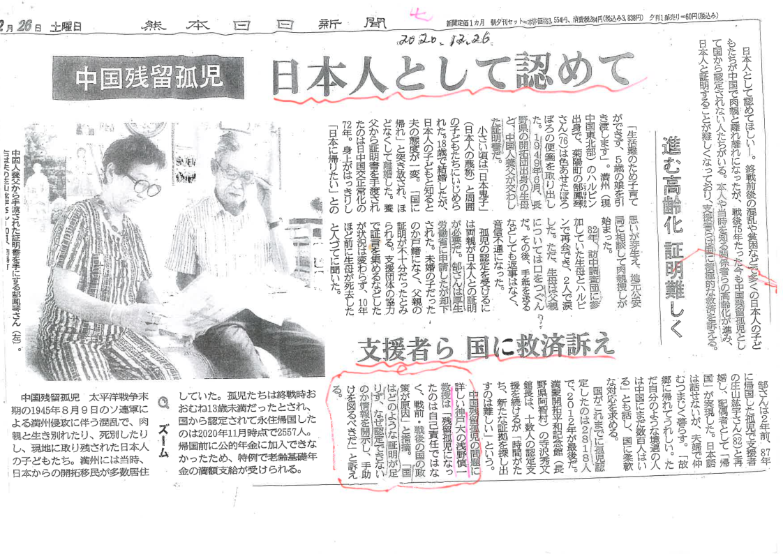 2020年12月26日,《熊本日日新闻》在文章《日本人として認めて》中指出,要取得证明很难。神户大学浅野慎一教授指出:“残留孤児になったのは自己責任ではなく、戦前、戦後の国策が原因。国はどのような証明が足りず、なぜ認定できないのか情報を開示し、手助けを図るべきだ”。(成为残留孤儿,责任不在于他们自身,而在于战前战后的国策。政府应当明确说明哪些证明不足,为何不能被认定,并给与帮助。)