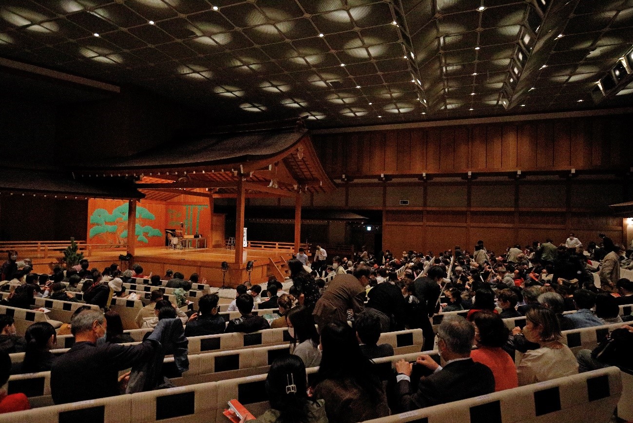 传统能乐舞台,是由“舞(舞蹈)”“谣(唱念)”和“囃子”(奏乐)共同构成的。能演员在表演的时候,不会佩戴任何扩音设备。为了将真实的效果传递给现场的每一位观众,全靠演员的真声、真嗓、真气。每场演出,都是对演员的表演和体力的一次严格考验。